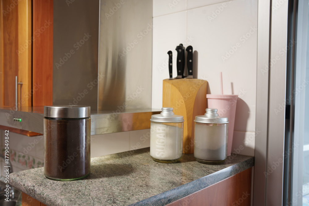 Bright kitchen scene, Sundrenched countertop where home chef prepares ingredients