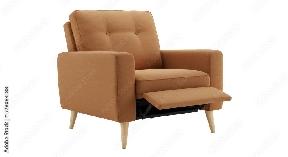 Comfortable caramel-colored recliner chair isolated on a clean backdrop, modern armchair with extended footrest for relaxation and home decor