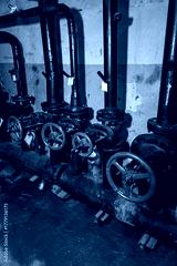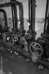 Old industrial pipeline system with several red wheel valves in a worn utility room, showing aged metal surfaces and signs of corrosion.