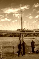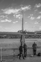 Fishermen at sunset in front of the Halic Metro Bridge in Istanbul, Türkiye