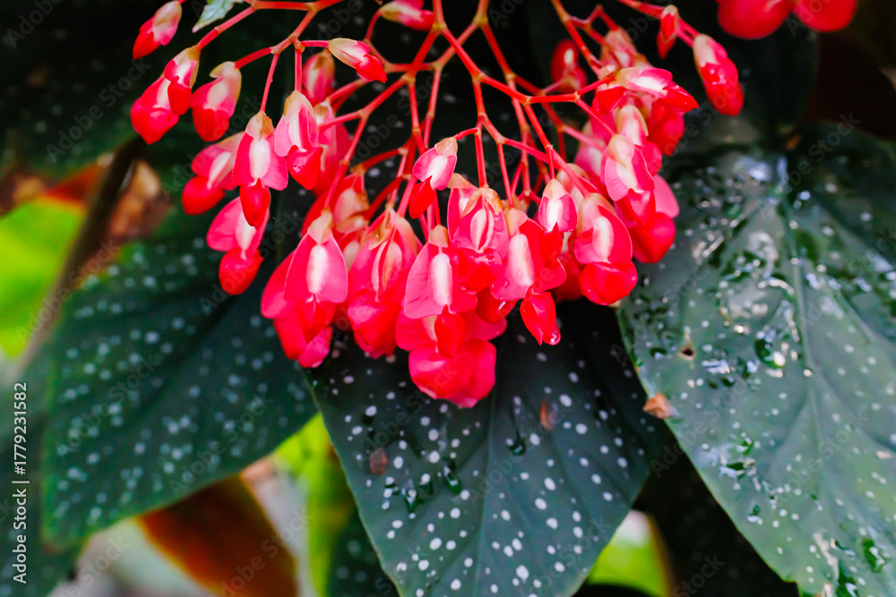 Bright red flowers bloom among green leaves in a garden after rainfall