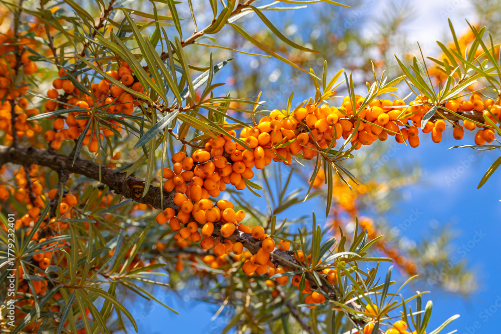 Bright orange sea buckthorn berries grow on branches in a sunny landscape