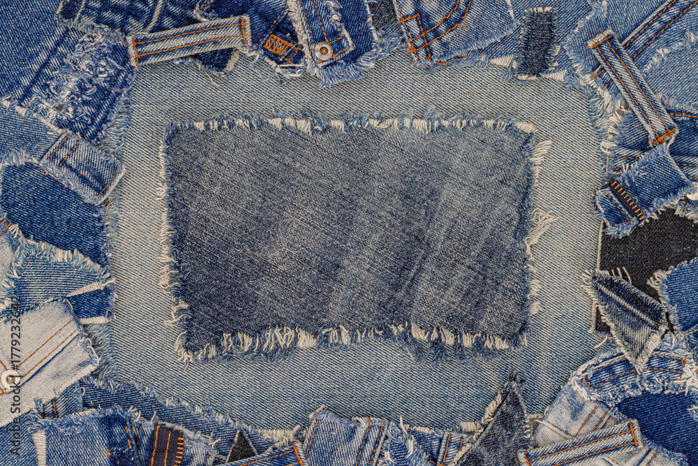 Creative denim patchwork showcasing textured blue fabric pieces surrounding a central blank denim square