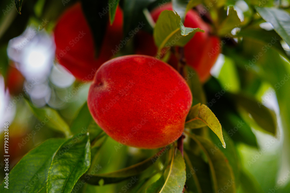 Luscious red peaches are growing on a tree, surrounded by green leaves in a vibrant orchard under warm summer sunlight