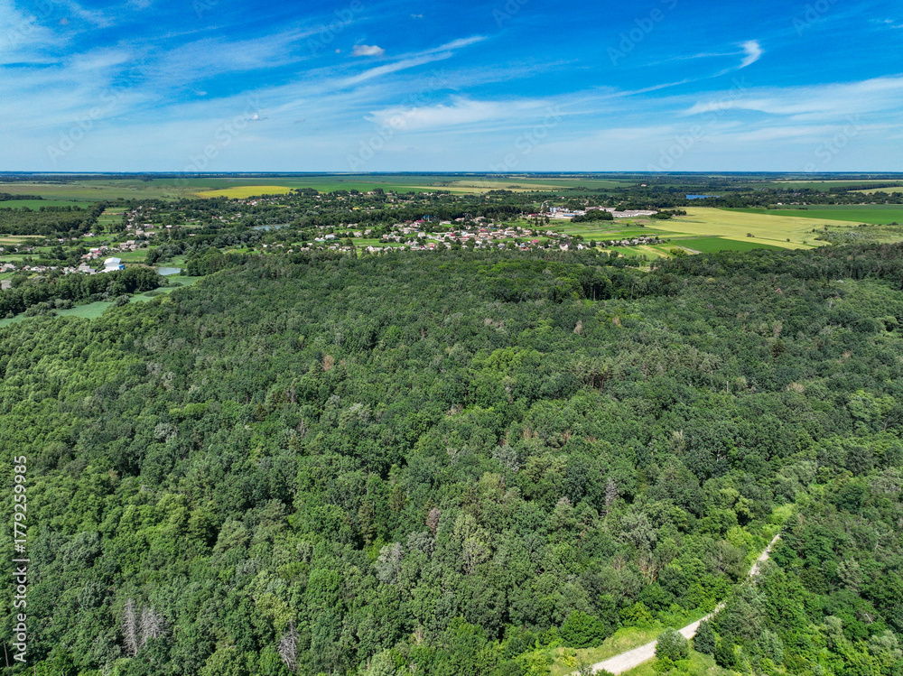 Aerial Landscape of Dense Forest and Rural Fields