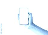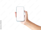 Close-up of hand holding modern smartphone with blank screen isolated on white background. High quality studio shot. Concept for technology, business, finance, advertising and public relations.