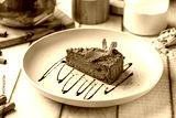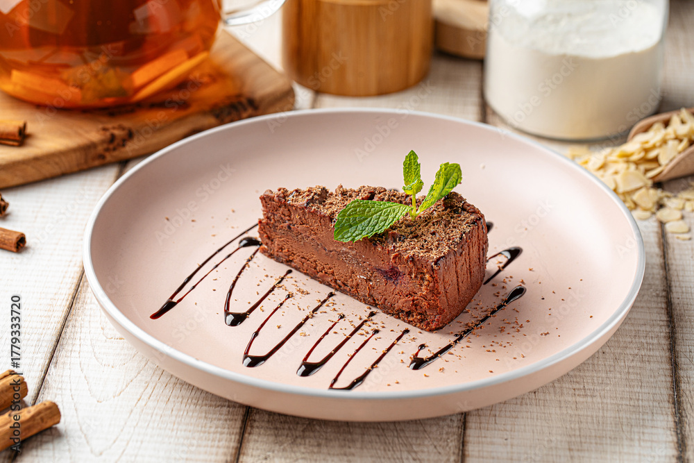 Slice of rich chocolate cheesecake garnished with mint leaves and chocolate syrup served on pink plate