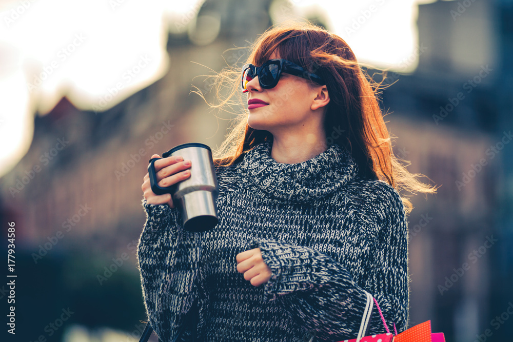 Woman walking on the street with coffee cup and shopping bags, city life concept