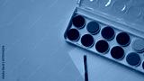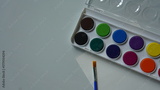 Watercolor paints and brushes on a white background, view from above