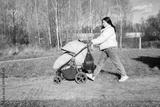 A brunette woman walks with her sleeping baby son in a green stroller in an autumn park.