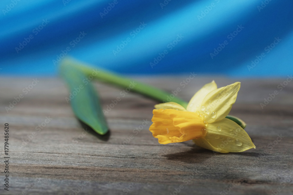 Single yellow daffodil flower with water droplets on rustic wooden surface; spring bloom against blue background — professional macro photography