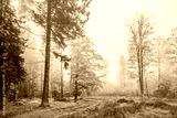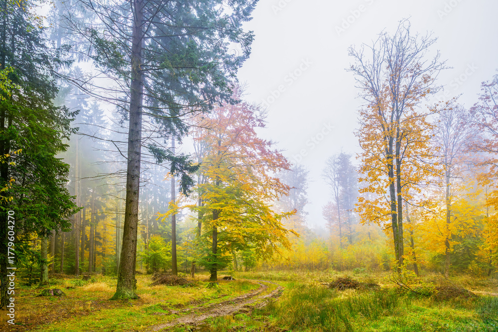 Jesienny, mglisty, deszczowy dzień w lesie.