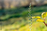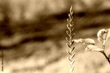 Close-up of a grass ear with delicate seeds against a softly blurred backdrop of an autumn garden.