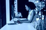 female at computer by window, professional woman diligently working on laptop beside large window