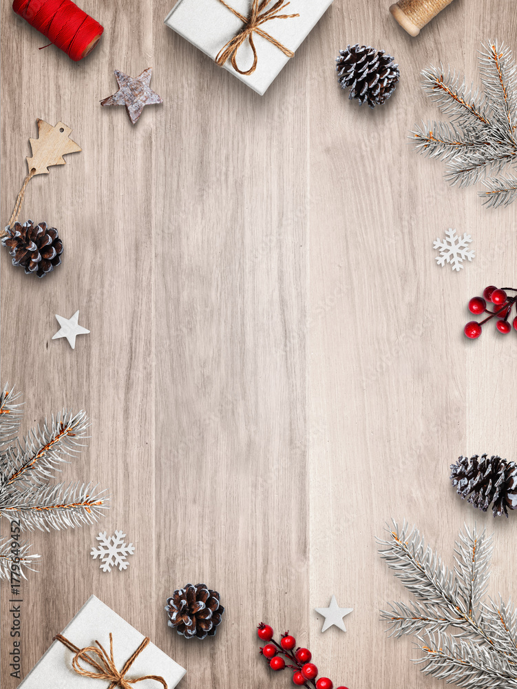 Vertical Christmas flat lay with pine cones, gifts, stars and red berries on bright wooden background, minimal holiday composition with copy space