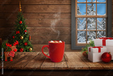 Warm Christmas scene with red mug of hot chocolate and marshmallows, decorated tree, gifts and snowy forest view through wooden cabin window