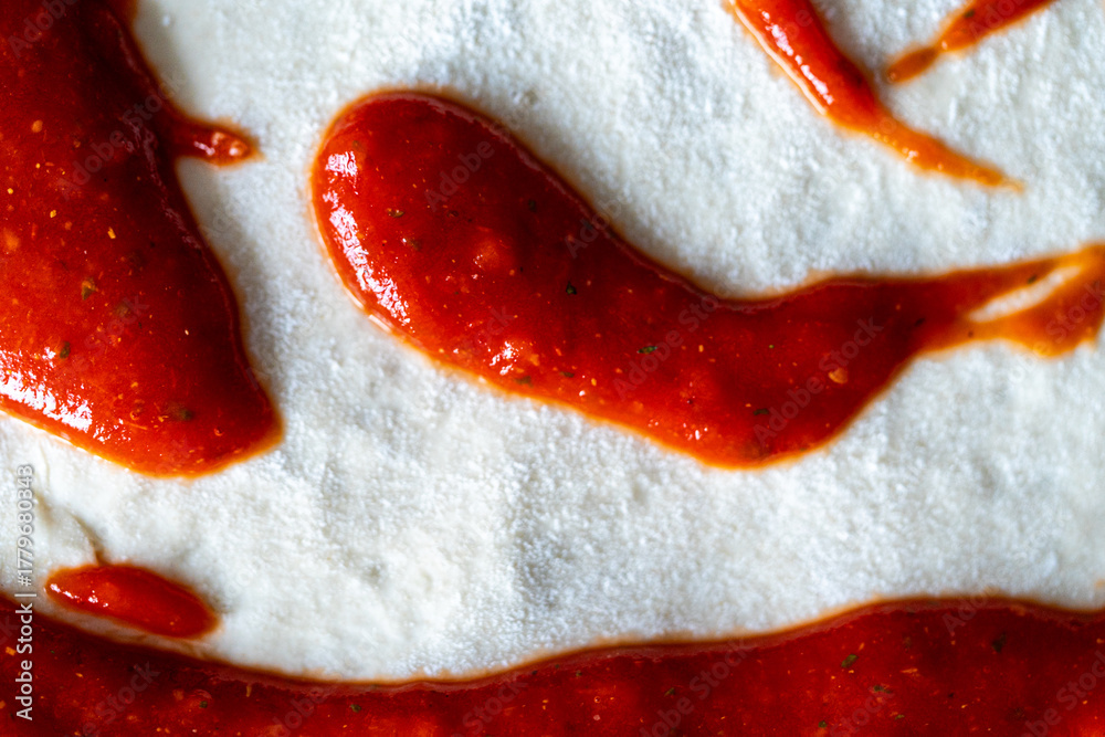 Tomato sauce for pizza on dough. The process of making pizza. Close-up, top view