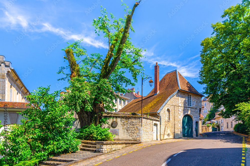 Road street leading up in Besancon old town centre ville, La boucle de Besançon city historic centre with medieval buildings in sunny summer day, Bourgogne-Franche-Comte region, France