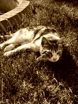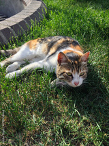 Calico cat resting on fresh grass. Calm, warmth, and the simple joy of animal presence in a peaceful green space.