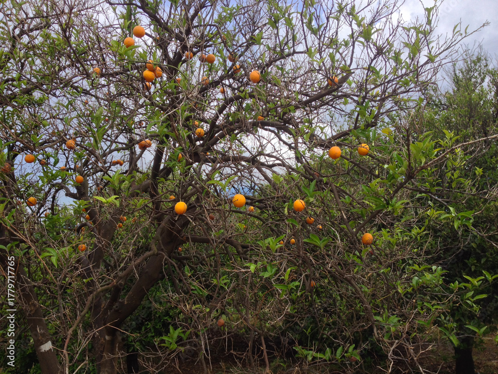 Orange tree full of ripe fruit under cloudy sky. Abundance, fertility, and natural harmony of Mediterranean landscape.