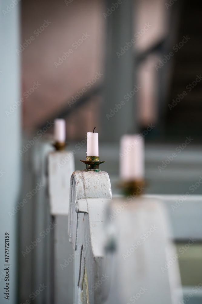 Close-up of a Candle on a White Wooden Church Pew