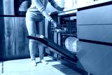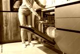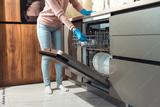 Woman unloads dishwasher in modern kitchen - dishwasher, unload, kitchen, plates, household.