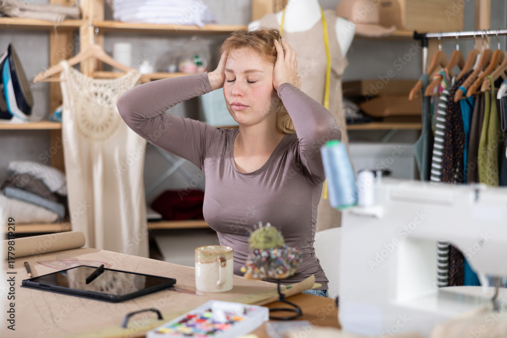 Exhausted from work, young female designer taking break in sewing studio, seated at table paper patterns in front of tablet with unfinished sketches and mug of coffee..