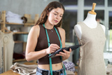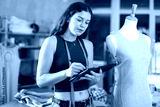Thoughtful young female dressmaker working on digital sketch of new dress in workshop surrounded by fabric, mannequins, and sewing equipment