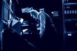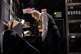 Senior intelligence officer studying case files and records in an evidence room, reviewing surveillance photos and classified information as part of a secret mission criminal investigation.