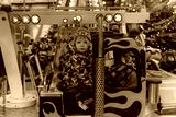 Little boy in winter hat sitting in orange truck cabin of colorful carousel ride with steering wheel and lights at Christmas market. Concept of childhood joy and festive amusement activities.