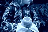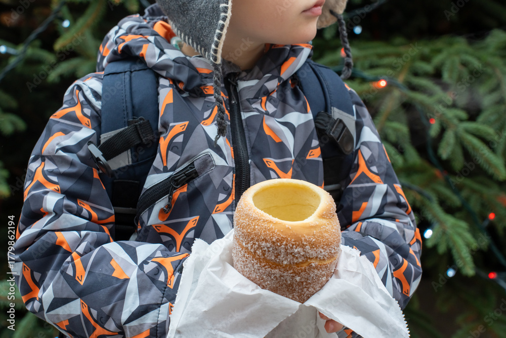 Little boy in winter jacket holding traditional trdelnik chimney cake from paper bag near Christmas tree with lights during holiday market visit. Concept of seasonal treats and childhood joy.