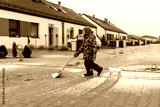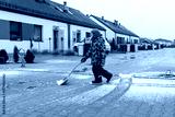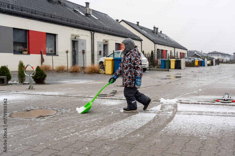 Child in winter clothes cleaning snow with a green shovel on residential street. Kid helping with outdoor chores on cold day. Winter activity, responsibility, and neighborhood life concept.