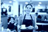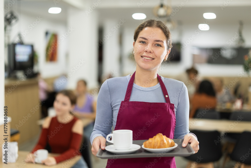 Young female waiter with tray of fresh coffee and croissant in cafe