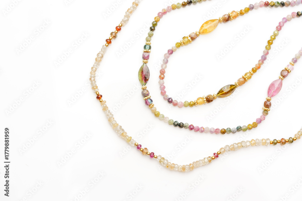 A collection of elegant necklaces made with natural gemstones displayed on a white background. Stylish jewelry arrangement showcasing vibrant colors, luxury craftsmanship, and natural beauty.
