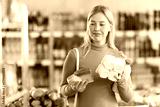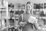 Young woman buyer chooses fresh dairy products in grocery store
