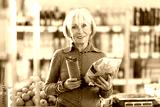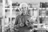 Elderly woman chooses tasty italian pasta to buy in the grocery department section of the store