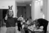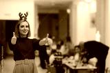 Happy Christmas Event Host Holding Thumbs up Feeling Cheerful. Event organizer feeling positive greetings guests