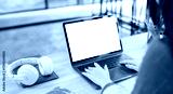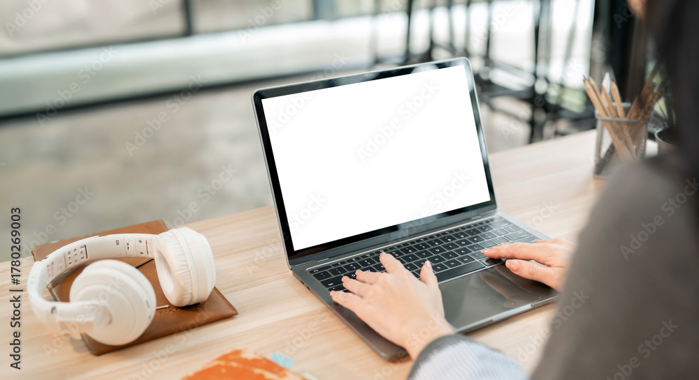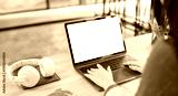 Close-up of a woman's hands typing on a laptop with a blank screen and white wireless headphones nearby.