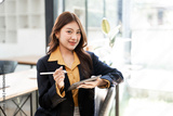 Close-up of a confident young Asian businesswoman using a digital tablet and stylus in a modern office.
