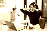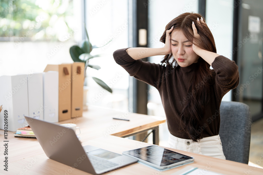 Exhausted young Asian woman suffering from headache or burnout while working on her laptop and tablet in an office setting.