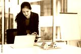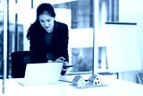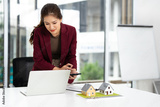 Mortgage home. real estate agent working on laptop using calculator application on mobile phone to find out the interest rate on a house mortgage.