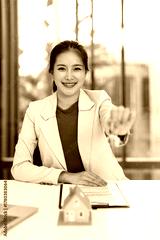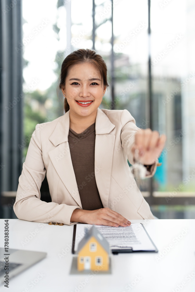 Real Estate Agent Offering House model and House Keys.
