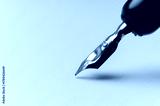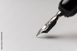 A close-up of a black fountain pen on a white background. Macro view of the pen tip.