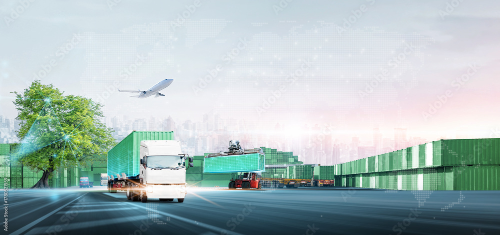 Green Logistics and Sustainable Global Supply Chain Export Concept for international trade and business management, emphasizing modern industrial truck and container transportation.