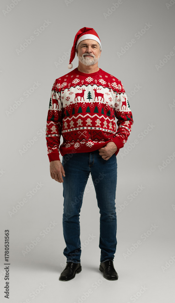 Full length of merry satisfied smiling mature man wear knitted christmas sweater Santa hat posing on isolated grey background