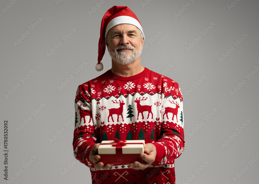 Merry mature man wear red warm knitted sweater Santa hat holding present box isolated on grey background New Year 2026