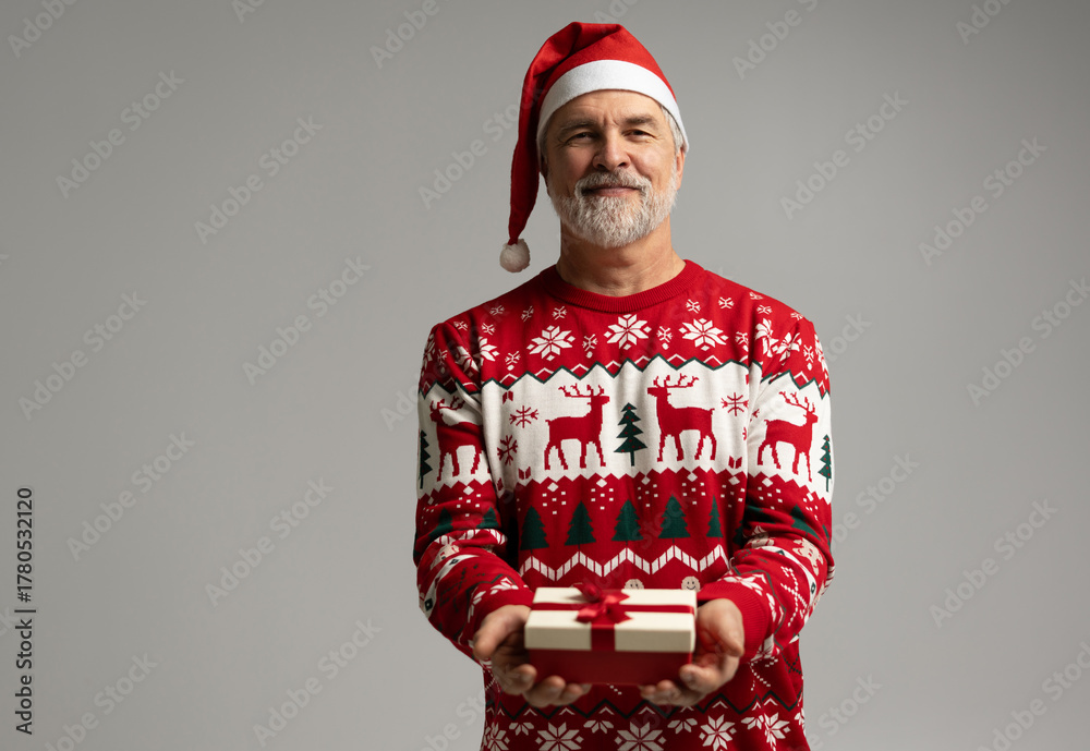 Merry mature man wear red warm knitted sweater Santa hat holding present box isolated on grey background New Year 2026