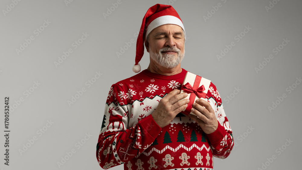 Merry mature man wear red warm knitted sweater Santa hat holding present box isolated on grey background New Year 2026