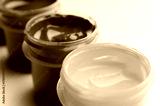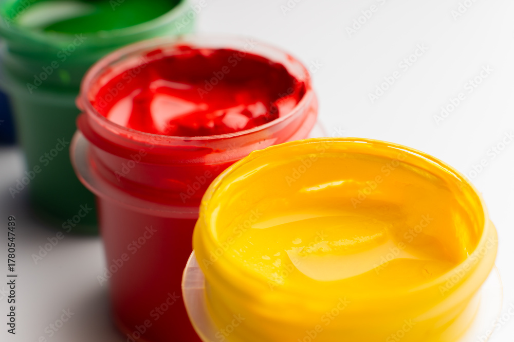 A close-up macro shot of open gouache paint jars. Multicolored paints in plastic jars with a shallow depth of field.