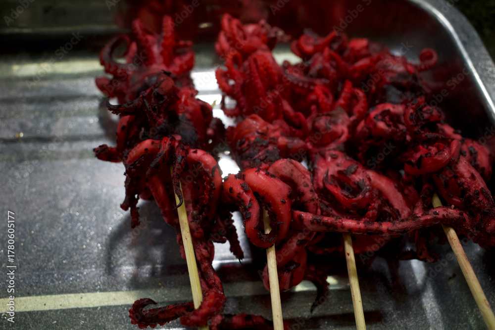 Red Octopus satay or squid satay with bamboo skewers, Indonesian street food